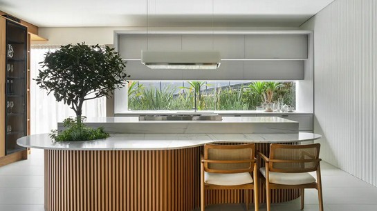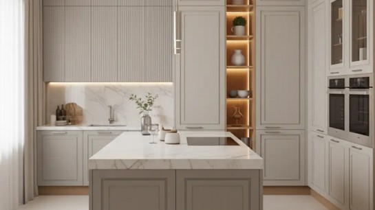 Cozinhas planejadas ganham elegância com molduras finas, frisos e paletas neutras, trazendo a leveza da estética grega e a imponência equilibrada dos romanos. A organização visual e a proporção correta tornam o ambiente mais luminoso e convidativo.