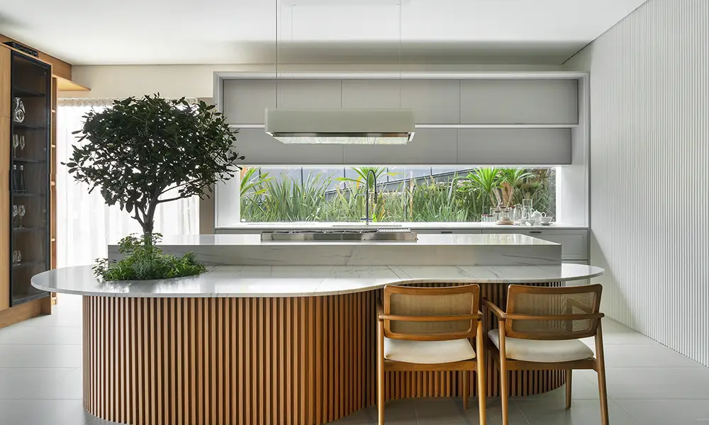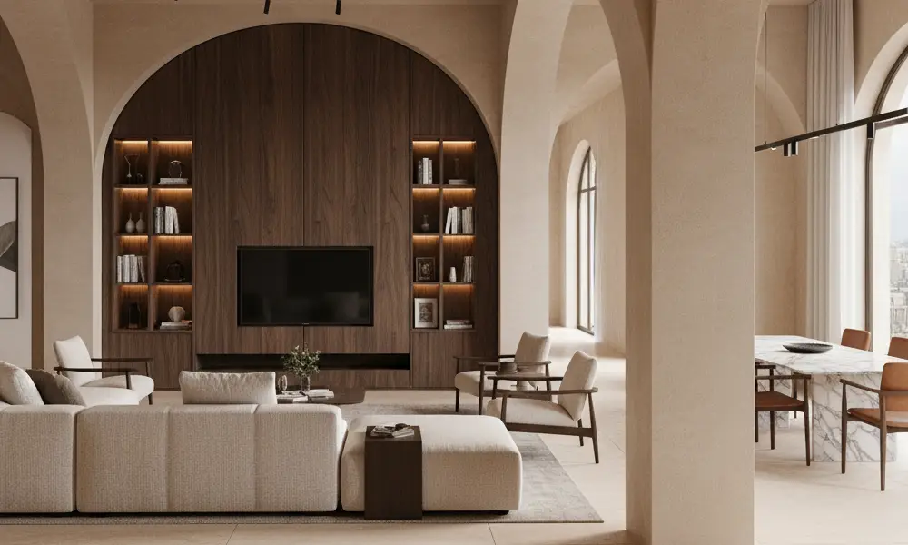 Os livings planejados se beneficiam da combinação entre arcos e painéis ripados, unindo a fluidez romana com a verticalidade grega. O resultado é um ambiente que inspira convivência, conforto e estética contemporânea.