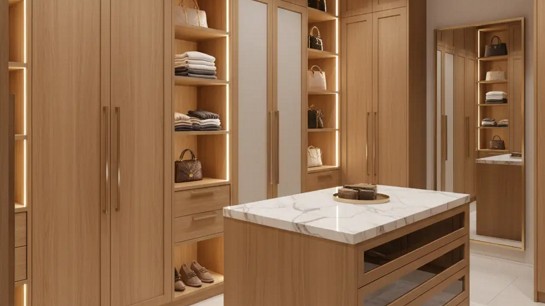 Em closets e dormitórios planejados, essas referências resultam em espaços sensoriais e refinados. A combinação de madeiras escuras, iluminação LED quente e metais marcantes cria ambientes com personalidade e atmosfera, mesclando tradição e modernidade com equilíbrio.